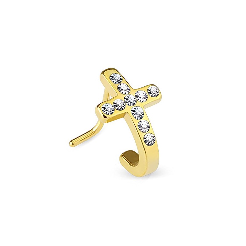 PiercedOff Gold Tone IP over 316L Surgical Steel L Bend Nose Stud with Pave Crystal Cross with Clear CZ Gems - Thickness 20GA (0.8mm) / Length 6mm / Cross Size 10mm