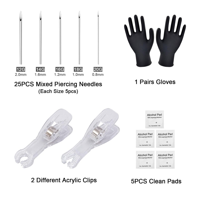 - 【MEET ALL NEEDS】 - The piercing kit comes with 2 different disposable clip-assisted piercing that ensure safety and comfort during the piercing procedure. Each clip is a disposable design. Five different sizes of piercing needles provide various options to fit your piercing needs.