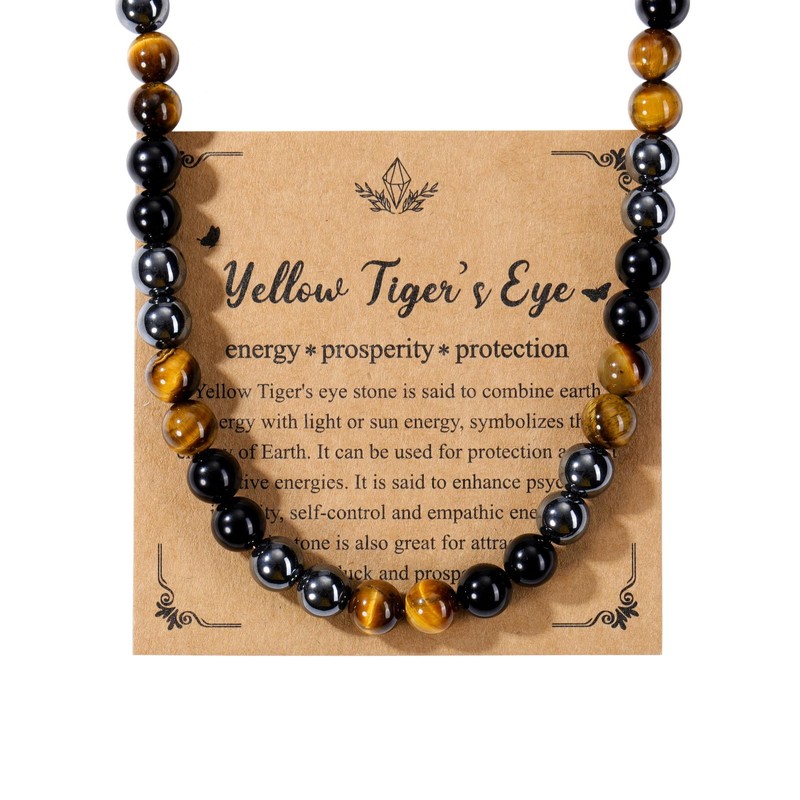 - Material - The pearl necklace is made of natural yellow tiger's eye, obsidian and hematite. Tiger's eye is a stone of courage, obsidian is the stone of grounding and protection, hematite is the stone of success, this crystal necklace gives you more confidence, strength, protection, and supportive of despondency.