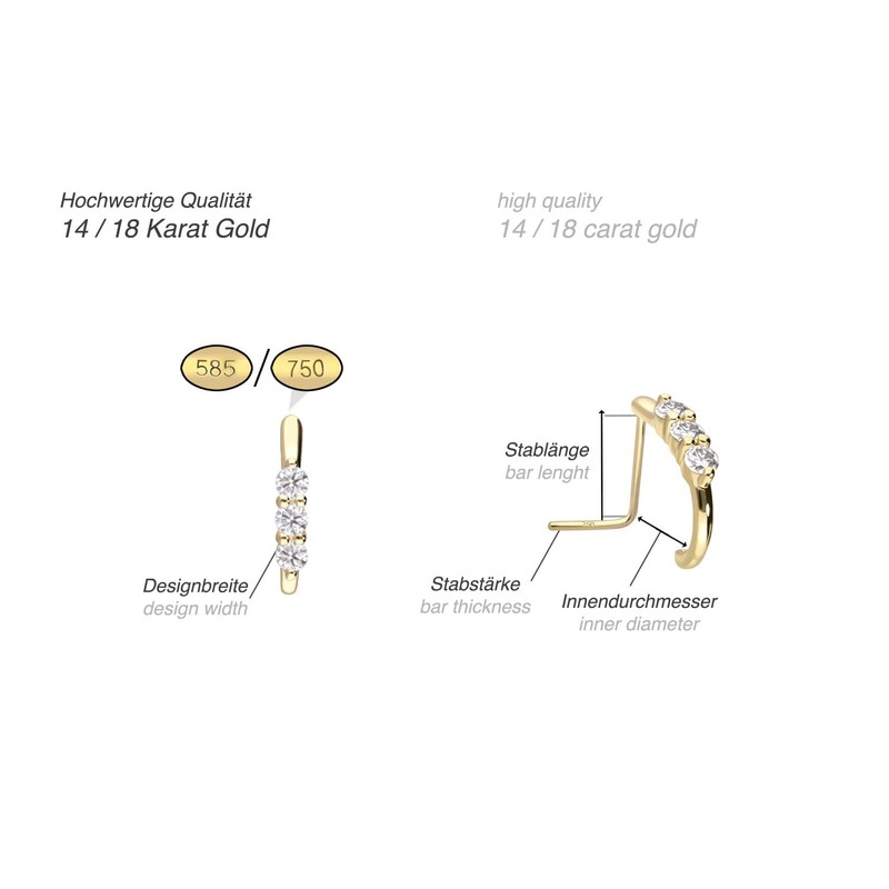 - Box contents: 1 nose stud | 585 yellow gold 14 carat | bar length: 7 mm | bar thickness: 0.6 mm | design width 2 mm | inner diameter: 8 mm | carat (moissanite): 0.09 ct.