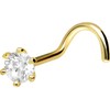 18 carat gold nose stud spiral set crystal. This elegant nose stud with set crystal is made entirely of high-quality 18 carat (750) gold, which in addition to its excellent quality also impresses with properties such as good skin compatibility and high resistance. It is available in yellow gold, rose gold and rhodium-plated white gold. Every single one of our 18-carat gold items is handmade with great attention to detail and is therefore unique. Thanks to the spiral bar of this piece of jewellery, a particularly firm hold in the nose is ensured. It always has a bar thickness of 0.6 mm, whereas its bar length is 6 mm. Material: 18 carat (750) yellow gold, rose gold, white gold (rhodium-plated). Surface: glossy. Material colour: gold/rose gold/white gold. Crystal colour: crystal clear. Bar thickness: 0.6 mm. Bar length: 6 mm. Crystal size: 3.5 mm. All dimensions are approximate