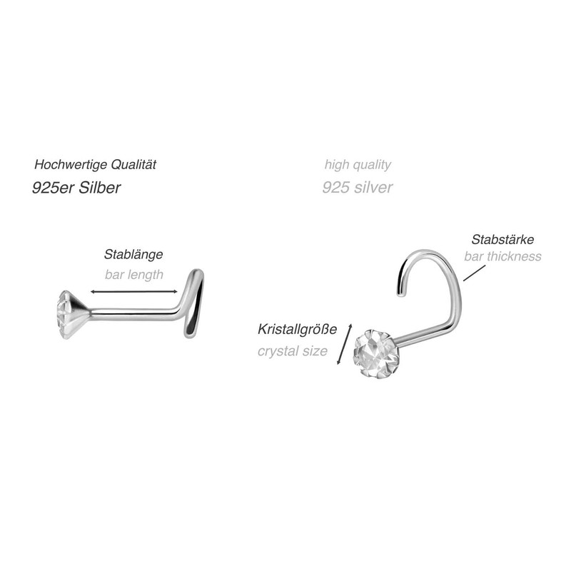 - Box contents: 1 nose piercing set of 3, 925 silver, silver colour, crystal colour: crystal clear, bar thickness: 0.6 mm, bar length: 5 mm, crystal size: 2.0 mm