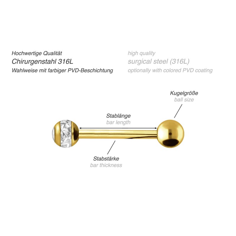 - Box contents: 1 surgical steel barbell with 1 epoxy ring ball, gold, crystal clear, 16 mm bar length, 1.6 mm bar thickness, 5 and 5 mm ball size