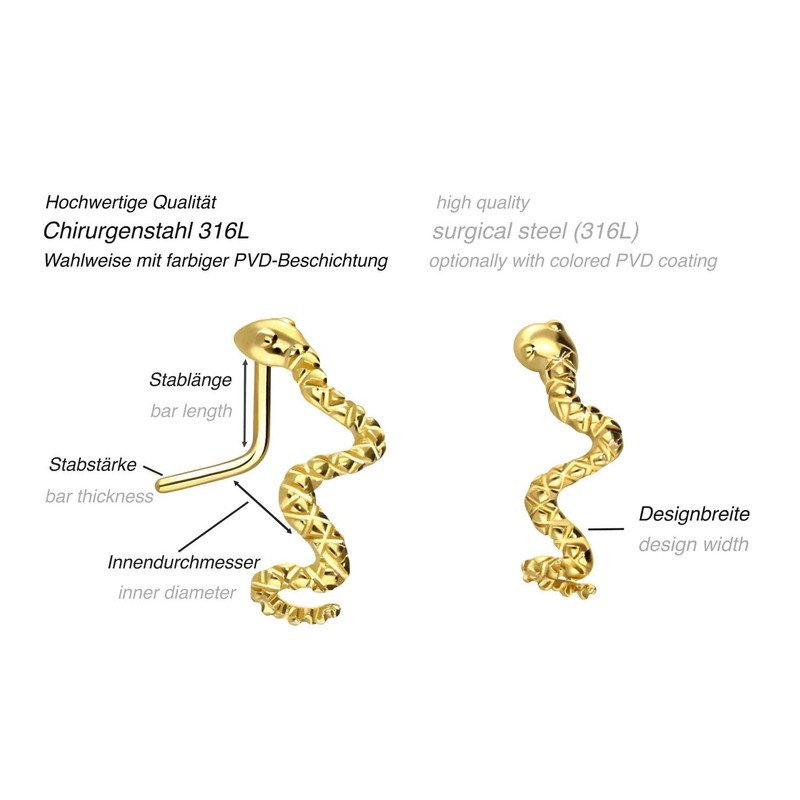 This nose stud combines a standard nose stud with a nose ring. It is made of 316L surgical steel and stands out with its elegant design. Thanks to the L-shaped bar, a good grip in the nose is ensured and the design, which is located outside the nose, is reminiscent of a closed nose ring thanks to its shape. The design is a twisted snake that elegantly decorates the nose and makes it eye-catching. The material used is characterised by its special properties such as colour fastness and material resistance. This piercing is optionally equipped with a coloured PVD coating.