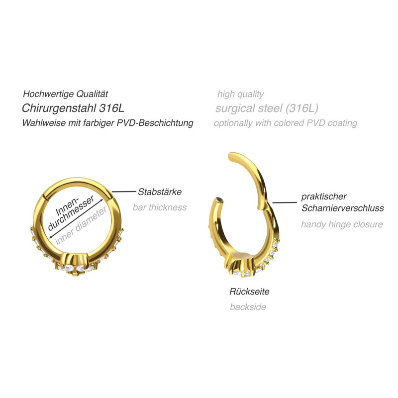 Easy to use and beautiful design - these are our clickers! The main feature of the clicker is the practical hinge, which makes it extremely easy to use in the stitch channel. The material used for production (surgical steel 316L) is characterised by its flat texture and high quality. Depending on the desired colour, the piercing is covered with a scratch-resistant PVD coating. Thanks to the many sparkling crystals, which adorn the remaining ring in addition to the petals, the piece of jewellery looks particularly charming. Whether on the ear, nose, or lip, our clickers are suitable for a wide range of piercing sites. This clicker has a bar thickness of 1.2 mm and is available in the inner diameters listed below.