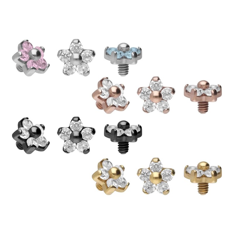 This beautiful flower is made of high-quality titanium and optionally coated with a coloured PVD coating. The 5 crystals give the flower that certain something. Thanks to the 1.2 mm thread, this piece of jewellery can be used as a screw attachment for our dermal anchors. The material used (titanium grade 23) is characterised by its special properties such as skin compatibility, colour fastness and durability. Depending on the material colour, the screw disc is available in the crystal colours listed below.