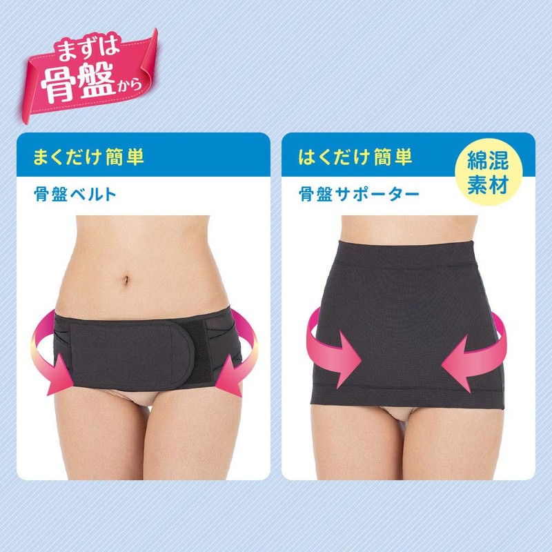 ・1段式でかんたん、サイドに伸縮性のあるクロスベルトを内蔵してるから、ピタッと前で留めるだけで骨盤にフィット!体調・体型に合わせて自由自在に調節できる!
