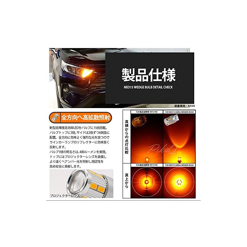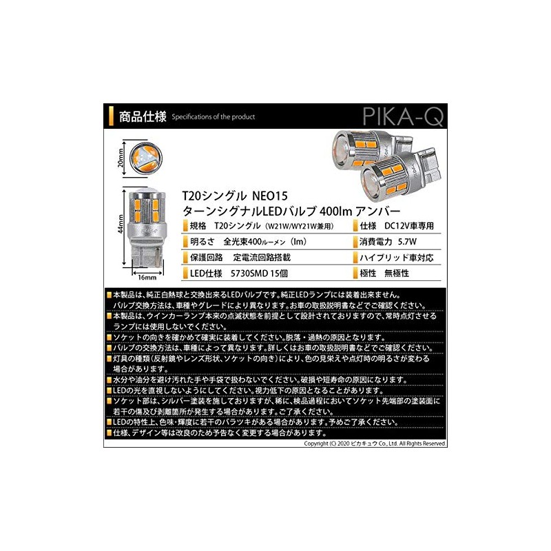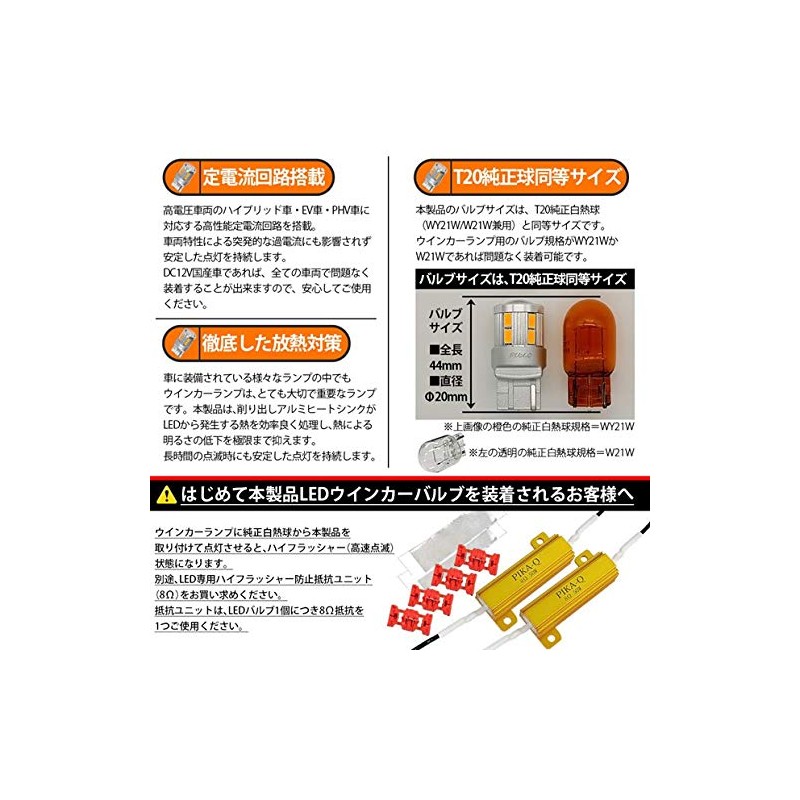 - ■ Applications: Turn signal lamp (front and rear compatible) ■ Warranty period: 18 months warranty from the date of purchase ◆ Pikaku all LED bulbs we handle are thoroughly inspected in Japan. When you install this product only on the turn signal lamp and turn it on, it will enter a high flashing state (fast flashing). Please purchase the LED high flasher prevention resistance unit (8Ω) separately. Use 1 resistor unit per turn signal LED bulb