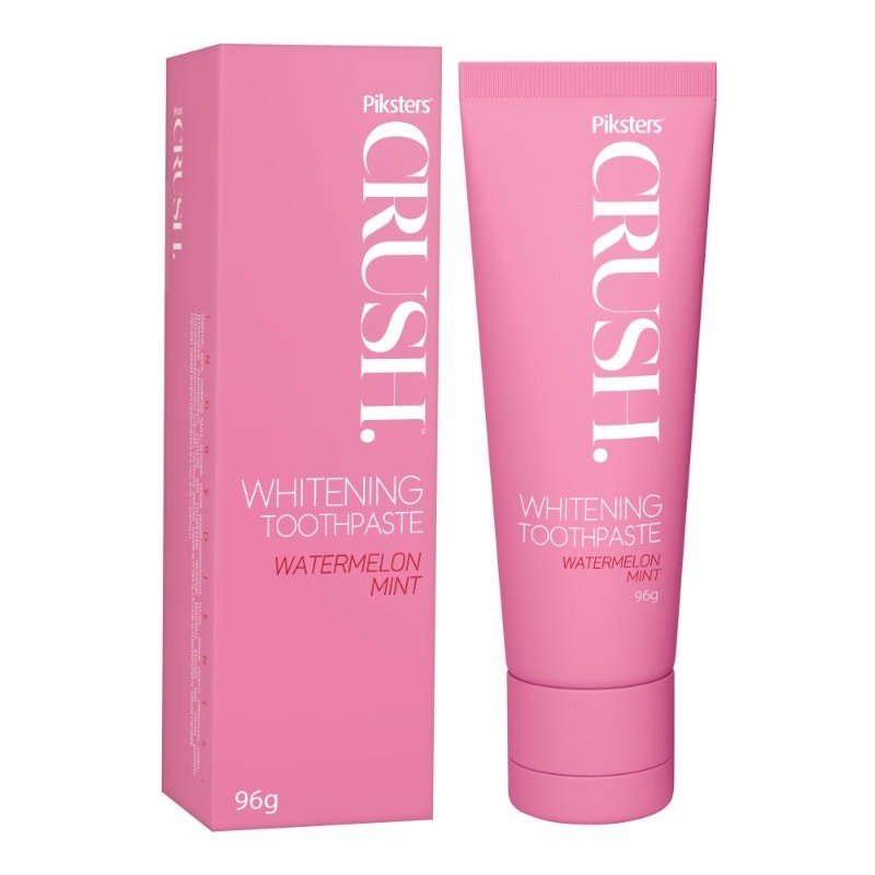 Crush your daily brushing routine with Piksters CRUSH Watermelon Mint Whitening Toothpaste. With each brush, enjoy a burst of flavoured freshness combined with essential fluoride (1450ppm) and PAP, an active ingredient used in professional teeth whitening products.