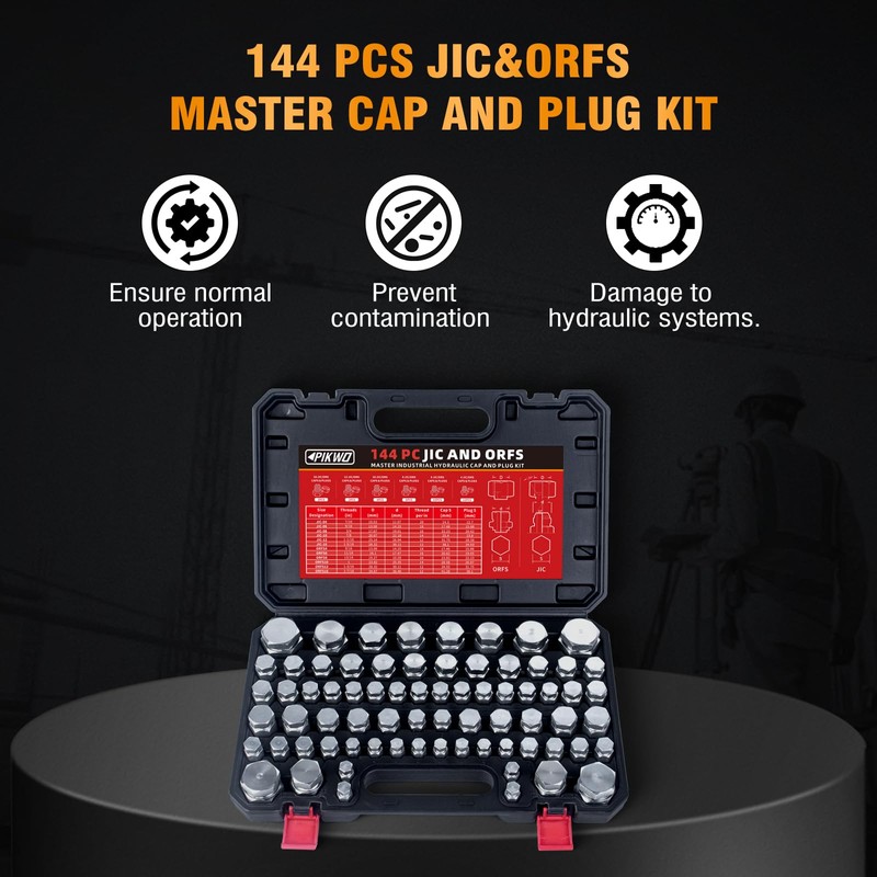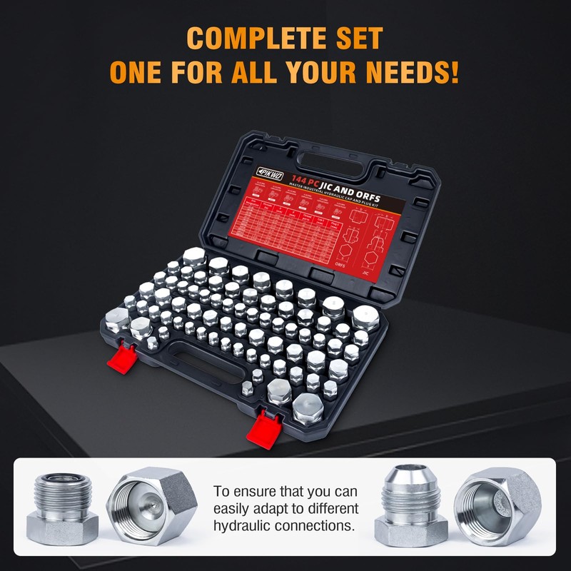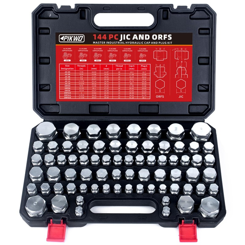 Pikwo 144 PC JIC and ORFS Master Industrial Hydraulic Cap and Plug Hose Tube and Pipe Fitting Kit Cap and Plug Kit Precision Threading in ORFS and 37° Dash Sizes 4 6 8 10 12 16