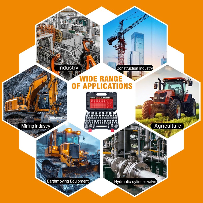 • Comprehensive Range: The set is meticulously organized to include all the essential models, ensuring you have the right plug for every job. The variety within the set covers a broad spectrum of hydraulic applications, providing a complete and ready-to-use solution.JIC & ORFS 4, 6, 8, 10, 12, and 16.
