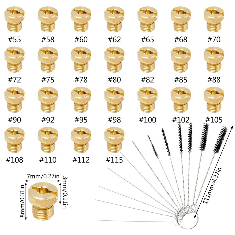 - COMPREHENSIVE KIT: This kit includes 12 cleaning needles and a range of carburettor nozzles m5 from 55 to 115 (55, 58, 60, 62, 65, 68, 70, 72, 75, 78, 80, 82, 85, 88, 90, 92, 95, 98, 100, 02. 105, 108, 110, 112, 115) and offers you everything you need for efficient carburettor maintenance.