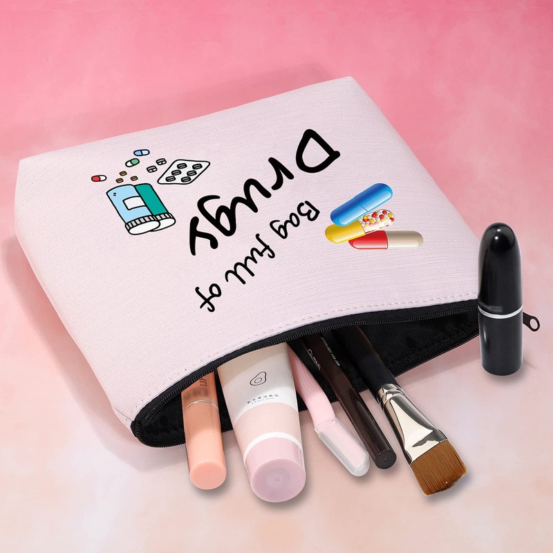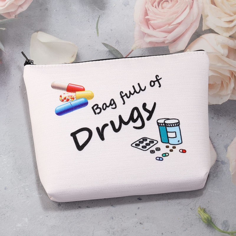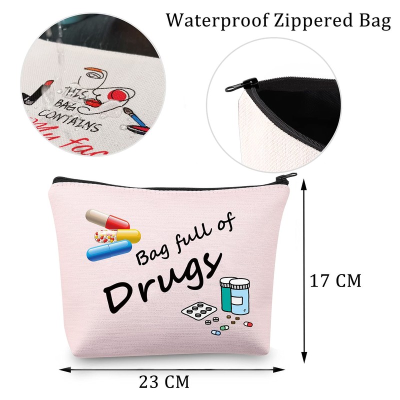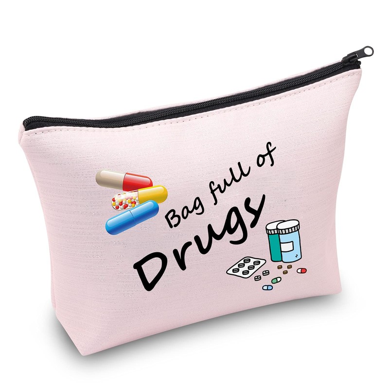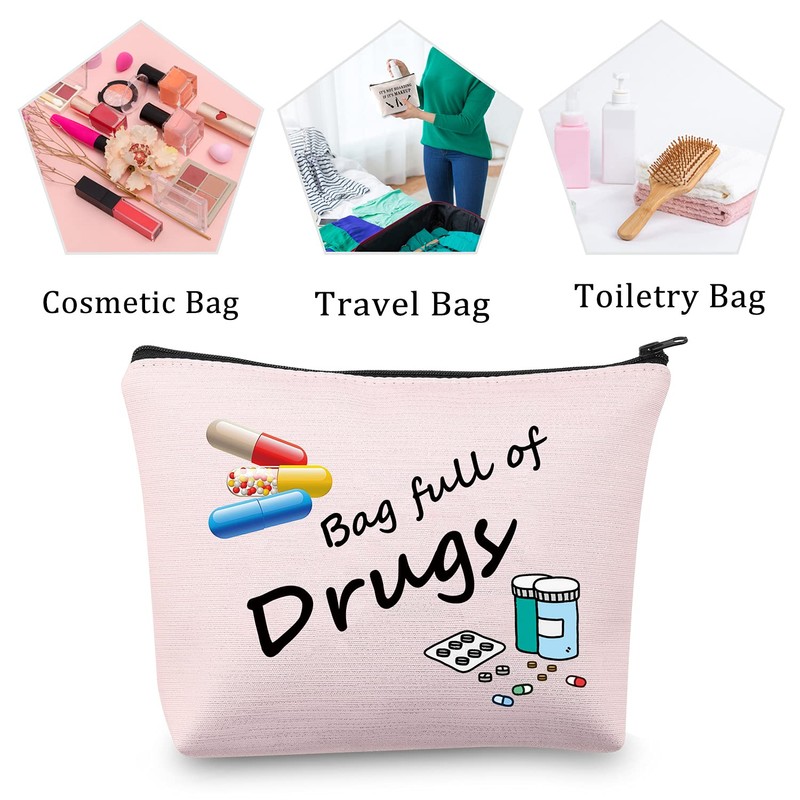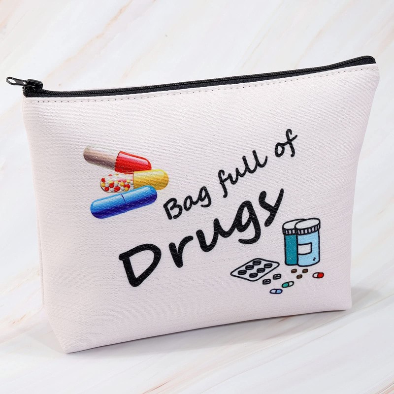 - Print: bag full of medicine toiletry bag makeup case funny travel bags cotton zipper pouch canvas toiletry bag for travel, school, dorms