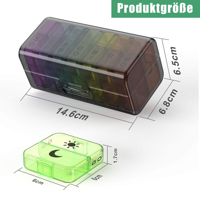 - Safety lock - After locking, the lids of the pill box close tightly and do not open by itself. Product size: 14.6 x 6.8 x 6.5 cm. Each daily box size: 6 x 6 x 1.7 cm.
