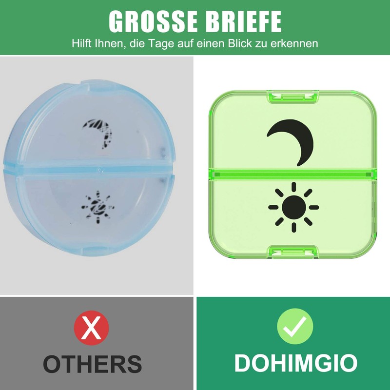 - Improved large labels - DOHIMGIO pill box 7 days 2 compartments use a unique and thoughtful design for large fonts - easy to read for elderly and myopia.