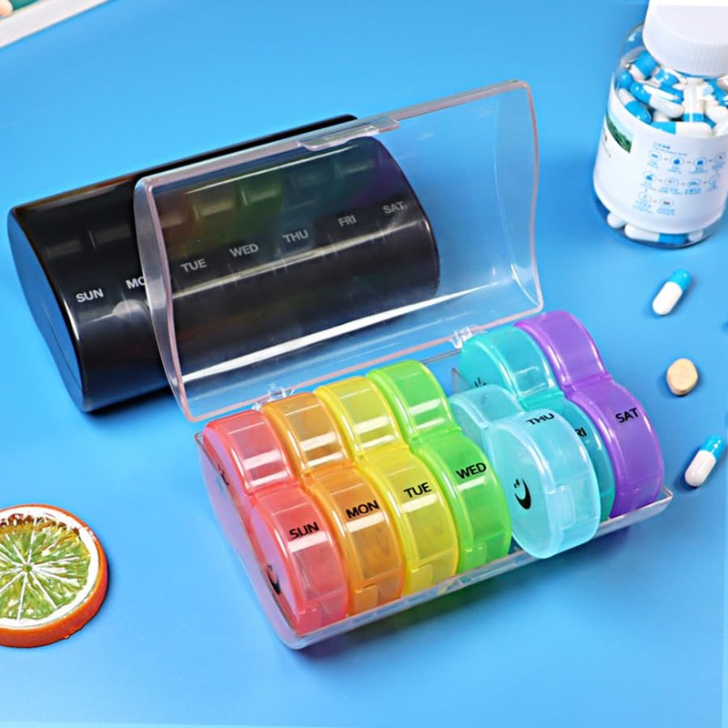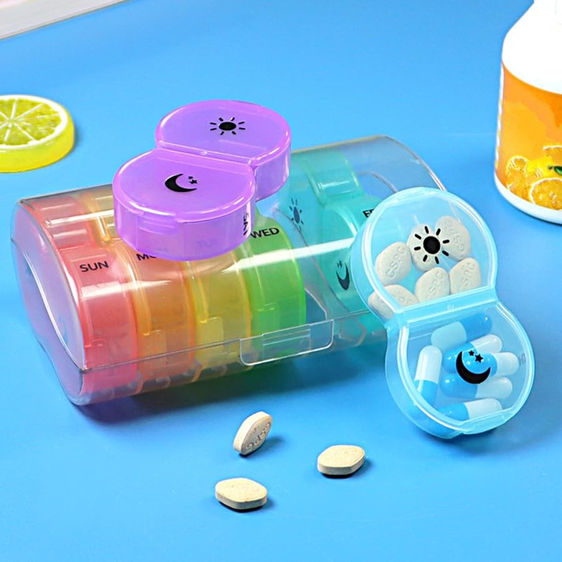- Practical: seven boxes set in a moisture-proof outer box. The abbreviation of the day of the week and the 7 different colours help to distinguish which day of the week the tablets are on. In addition, the lid has sun and moon symbols to distinguish between the two or day and night doses.