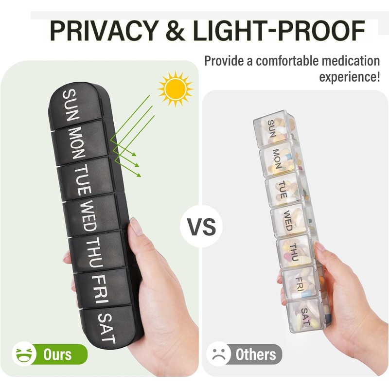 - 【Frosted Surface Design】Medicine Organizer adopts a light blocking and frosted surface design, helps keep pills' privacy and avoids direct sunlight to keep the effectiveness of the medicine.