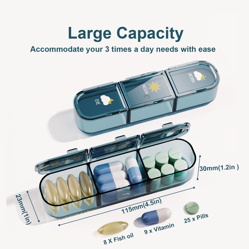- Ergonomic Designed: This Large weekly pill organizer 3x a day have 7 detachable boxes, each with 3 compartments for morning, noon, and evening doses. Each compartments can hold 8 fish oils or 12 capsules,it helps keep your routine organized for a smarter, healthier lifestyle
