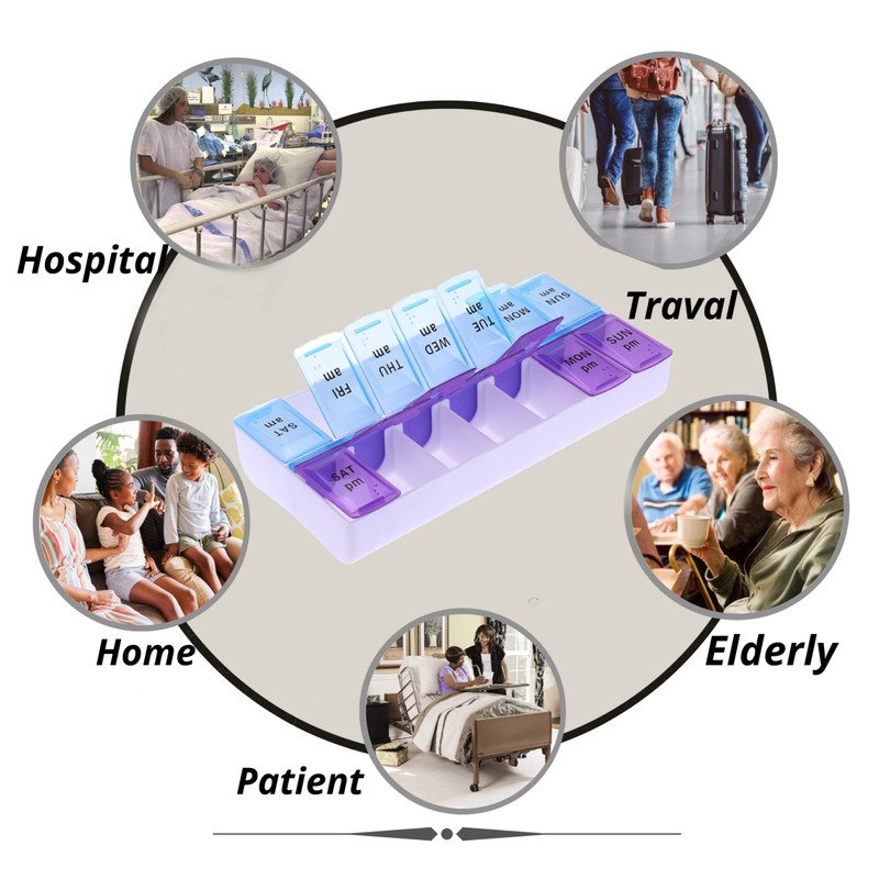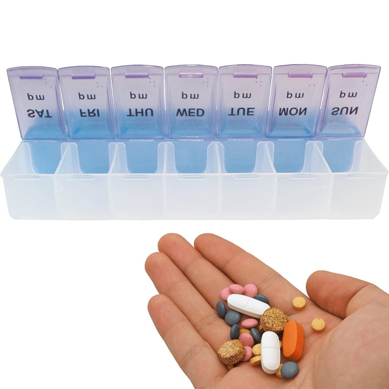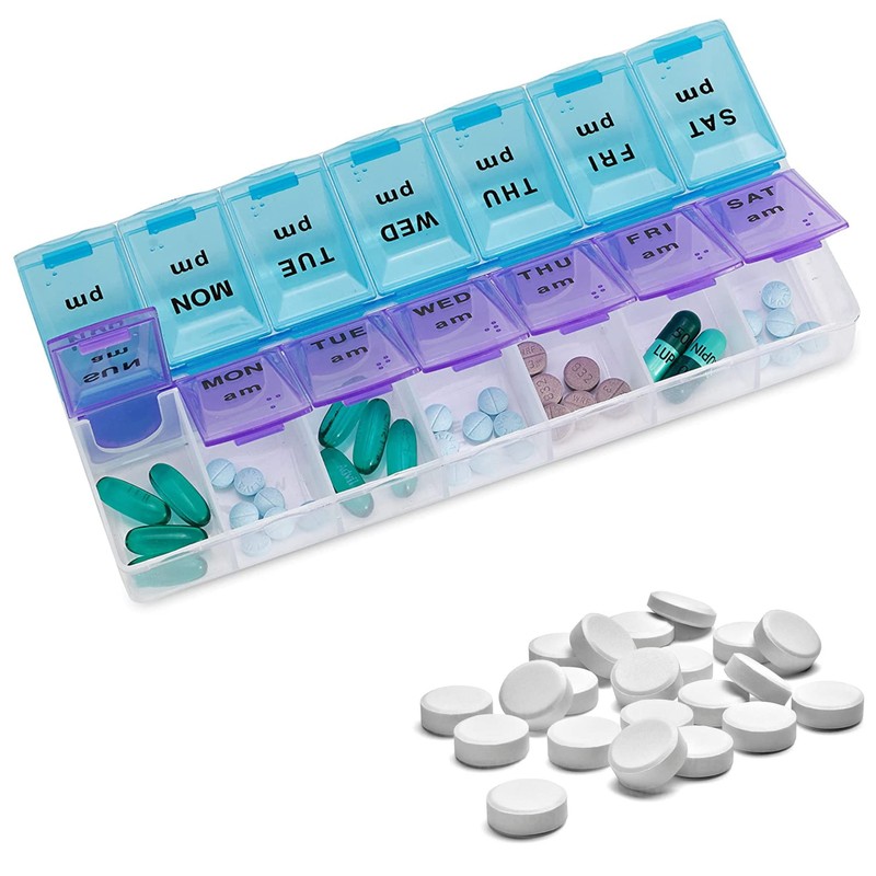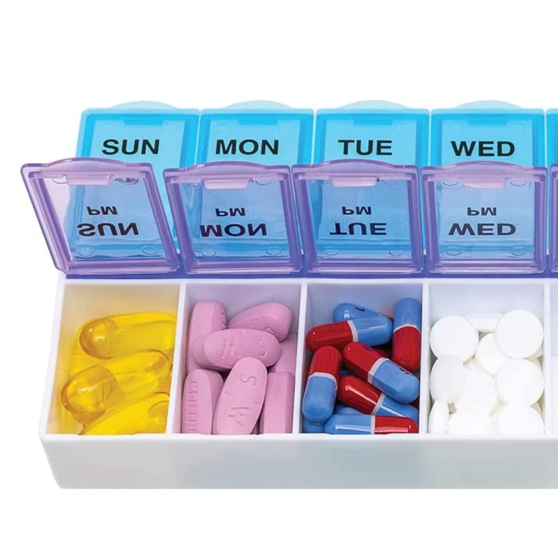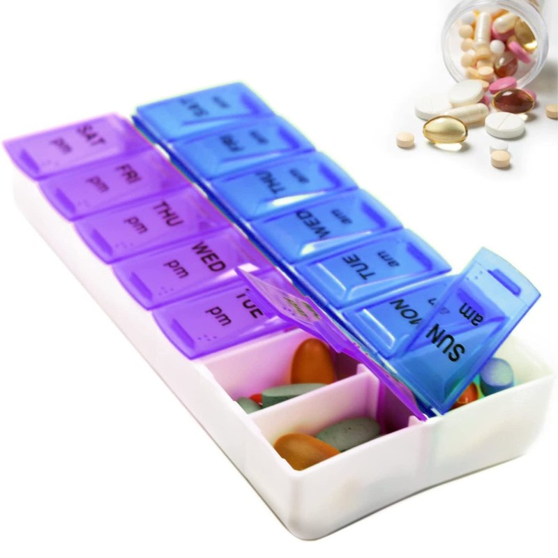 - Pill Box has 14 separate compartments to hold the pills or tablets for each day of the week.