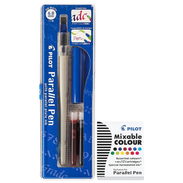 Pilot Parallel Calligraphy Pen Set, 6.0mm Nib, Blue Cap with Black and Red Ink, Plus 12 Assorted Color Ink Refills