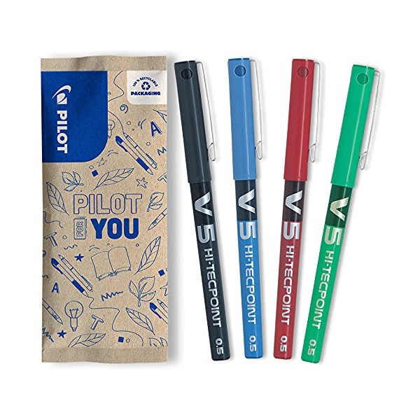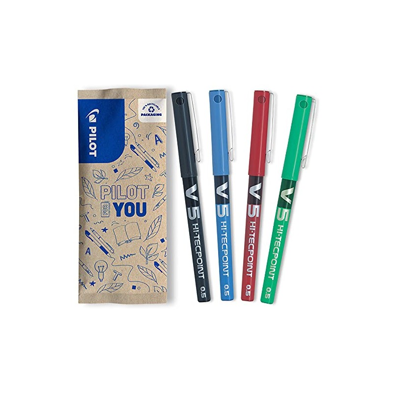 Pilot V5 Liquid Ink Rollerball 0.5mm Tip - Black/Blue/Red/Green (Pack of 4)