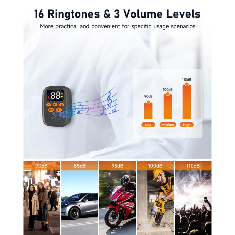 - Newly Upgraded: This caregiver pager wireless call button has 16 built-in ringtones & 3 volume levels to choose from. It also features vibration, one-click mute and low battery reminder,making it more practical and convenient for specific usage scenarios