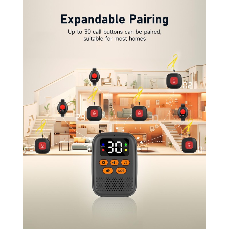 - Pre-paired and Expandable Pairing: The two help button for elderly and the caregiver pager come ready to use with default numbers 1 and 2 assigned. Each receiver can be paired with 30 call buttons, it's an ideal choice for elderly care products