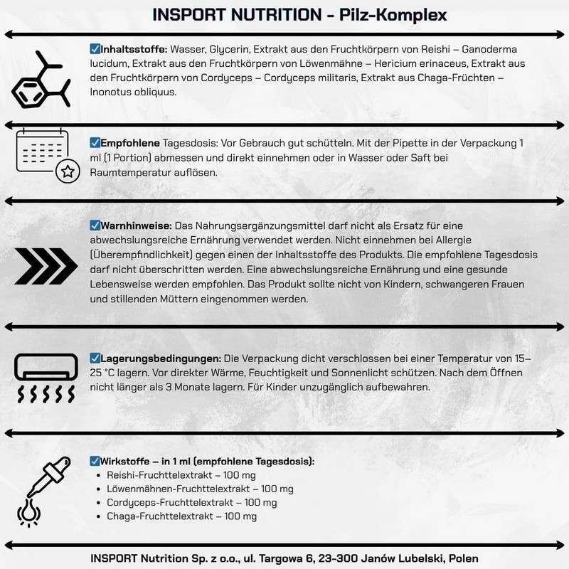 Pilz-Komplex Tropfen – Lion’s Mane, Cordyceps, Reishi & Chaga – Hochdosierte Extrakte für Fokus, Immunsystem & Energie – INSPORT
