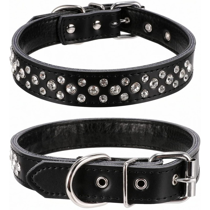Pimaodog Rhinestones Dog Collar, Adjustable Sparkly Crystal Studded Genuine Leather Pet Dog Collar for Small and Medium Dogs (S, Black)