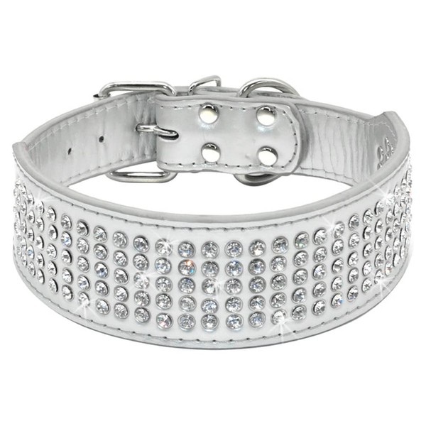 Pimaodog Rhinestones Dog Collars 5 cm Width PU Leather Full Sparkly Crystal Diamonds Dazzling Sparkling Elegant Fancy Dog Collar for Medium & Large Dogs (S:15-18 inch, Silver)