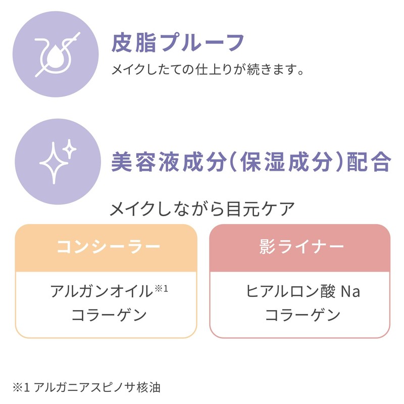 - [Moisturizing Formula for Eye Care While Applying] Concealer: Argan Oil*/ Collagen Liner: Collagen/Hyaluronic Acid *Argania Spinosa Nuclear Oil