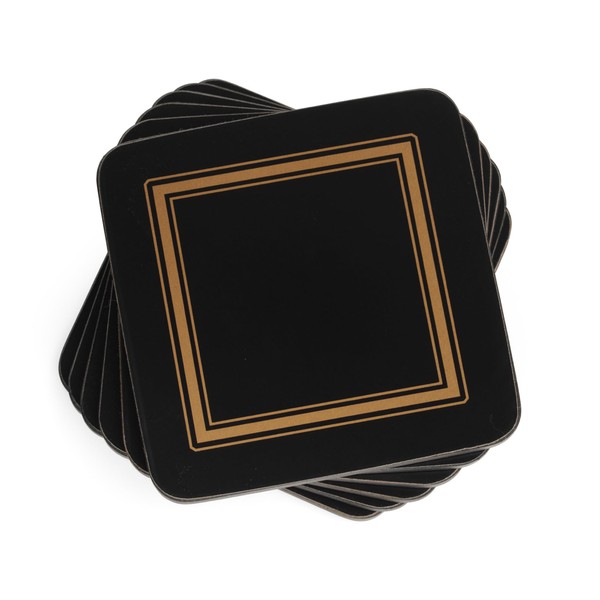 - PRODUCT SPECIFICATIONS: Package contains (1) Pimpernel Classic Black Collection Coasters - Set of 6. Made of Cork-Backed Board. Each Coaster measures 4 inches x 4 inches. Product Care: Clean with a damp sponge and dry with a soft cloth. Do not immerse in water.