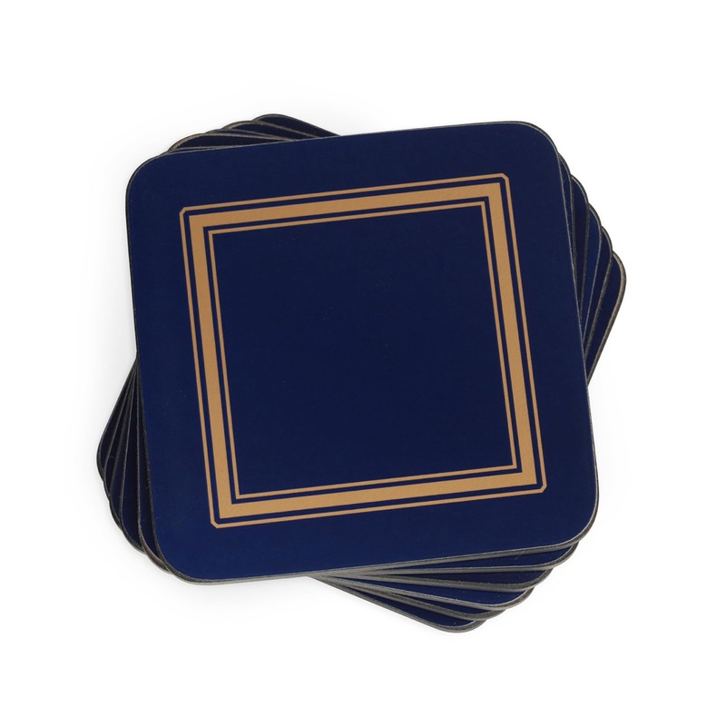 - PRODUCT SPECIFICATIONS: Package contains (1) Pimpernel Classic Midnight Blue Collection Coasters - Set of 6. Made of Cork-Backed Board. Each Coaster measures 4 inches x 4 inches. Product Care: Clean with a damp sponge and dry with a soft cloth. Do not immerse in water.