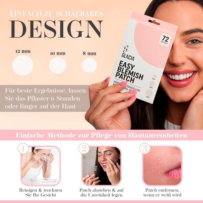 - Natural oils – Our pimple patches contain tea tree oil and marigold oil to promote the natural fight against blemishes. One pack contains 96 pimple patches and a range of sizes (12mm, 10mm and 7mm) - no matter how big or small the pimple is, Glacia has you covered.