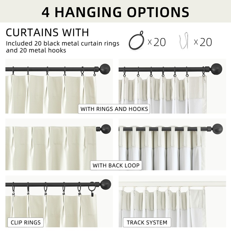 - 【Multiple Hanging Ways】4 Hanging options to meet your different home decor need. Method 1): Hanging hooks on rings for a beautiful elegant Pinch Pleat style.(hooks, rings are included) Method 2): Using Back Tabs to get a modern pleated look, easy to hang and hide the rod. Method 3): Simply using Clip Rings on curtain header for easy slide open and closed. (clip are not included) Method 4): Hanging hooks on track system to easy slide and for a luxury look.