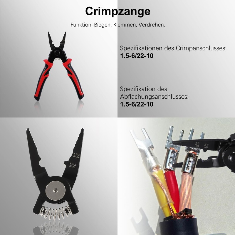 - Pliers and scissors kit: includes steel wire pliers, wire strippers, crimping pliers, tin snips and cable wire cutters. The pliers can bend, clamp, twist and twist steel wire, iron wire, copper wire and other metal wires. The stripper can strip cables from 10-22 AWG. The crimping tool can crimp cable lugs from 1.5-6/22-10. The tin snips can cut hardnesses of less than HRC 20. The cable cutter can cut cables up to a maximum diameter of 16 mm.