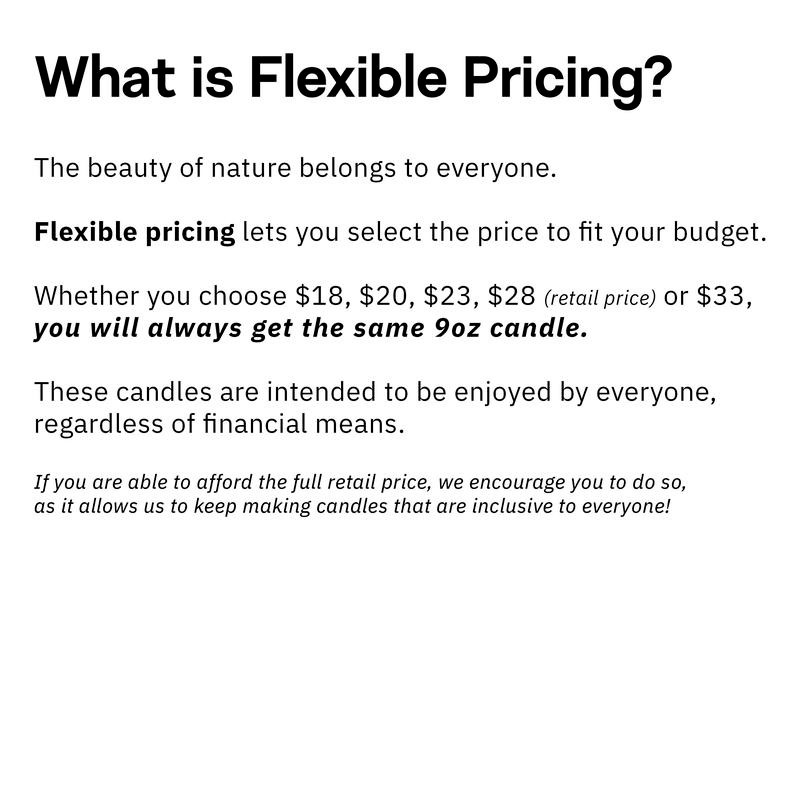 All of our candles are priced on a sliding scale. No matter which price you select, you will always receive the same 9oz candle. We want to make our products accessible and inclusive to as many people as possible because we believe that nature and luxury should be enjoyed by everyone. If you are able to afford the full retail price ($28.00) we encourage you to select that option, as it helps us continue to make candles that are accessible to all.