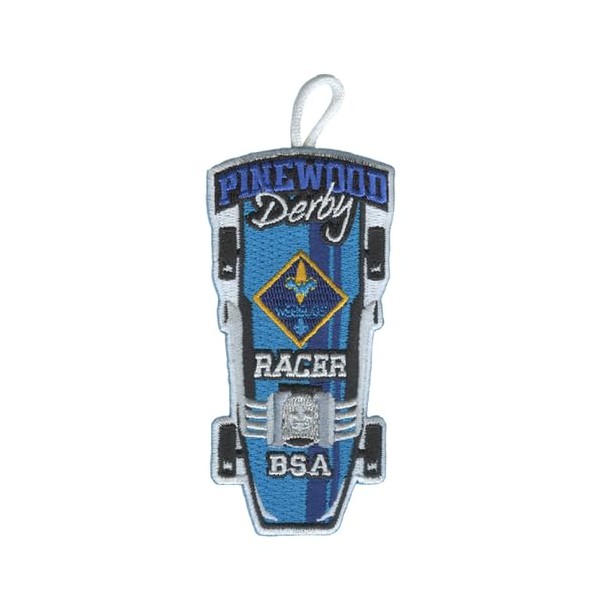 This Pinewood Derby patch features a cool pinewood derby race car design with the logo. It comes fully embroidered with a laser cut edge and is finished with durable plastic backing and a button loop.