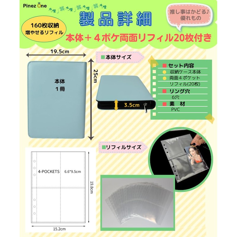 PinezOne A5 Trading Card Trading Card Files Pressing Storage Case with Zipper Binder, 4 Pockets, Double-Sided, Transparent Refills, Set of 20, 160 Cards, Can be Added (Ice Blue, A5)