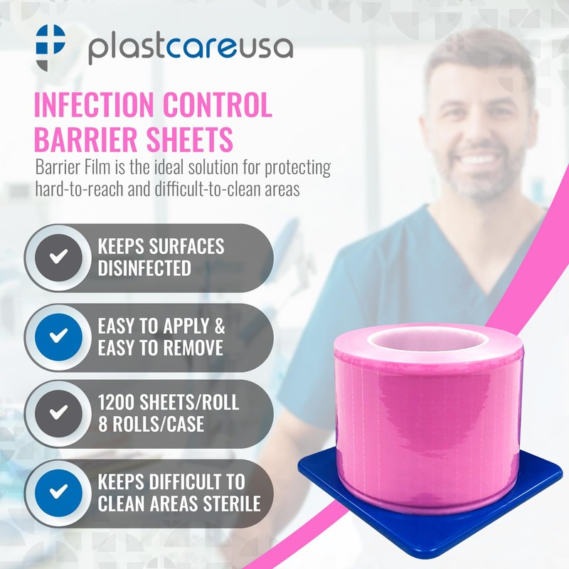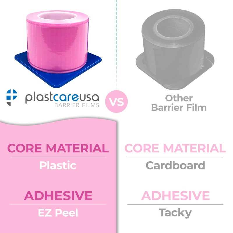 - PINK BARRIER FILM: Barrier film is essentially a medical-grade plastic wrap with a self-adhesive backing. We have made our barrier film roll dispenser easy to use by cutting it into 4” by 6” sheets that can be cut or molded into different shapes and sizes to fit the instruments or equipment they protect—water syringe handle covers, hose covers, pen sheaths, etc.