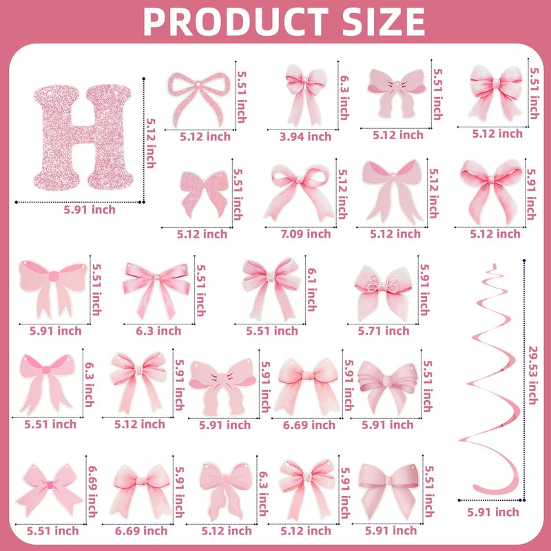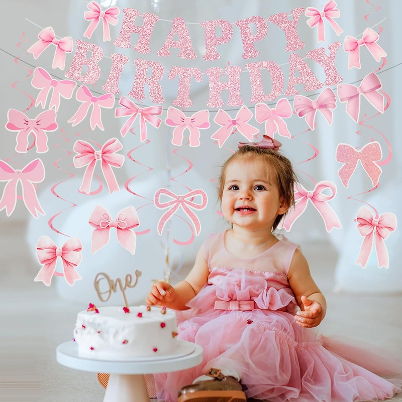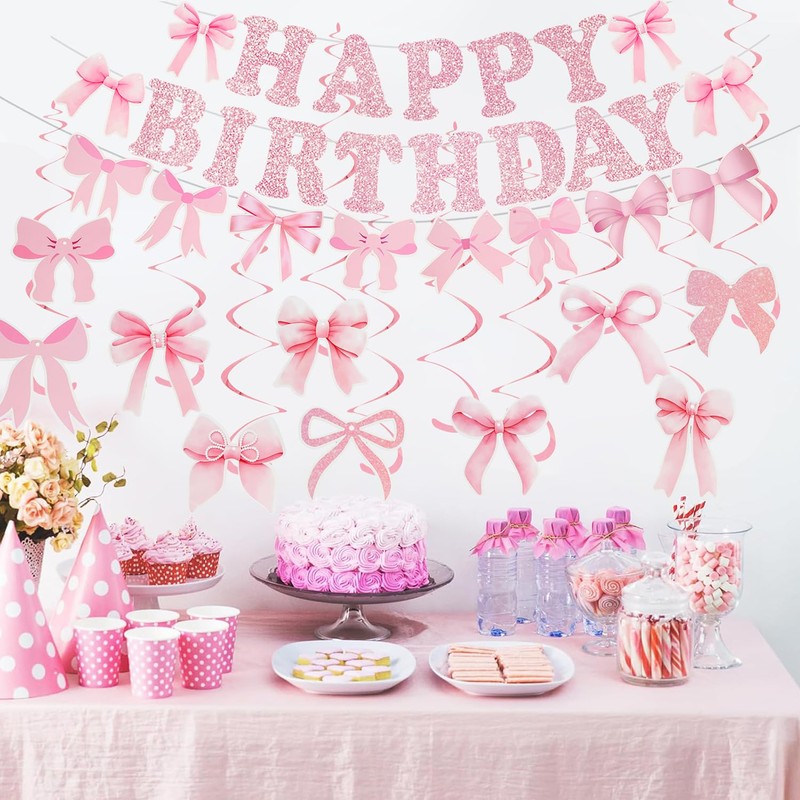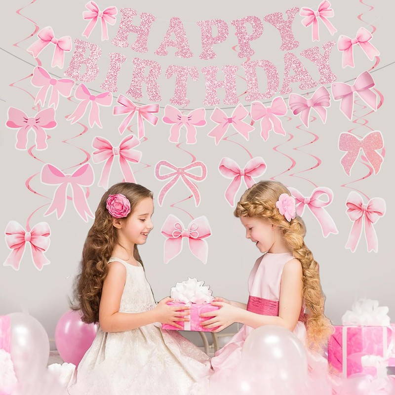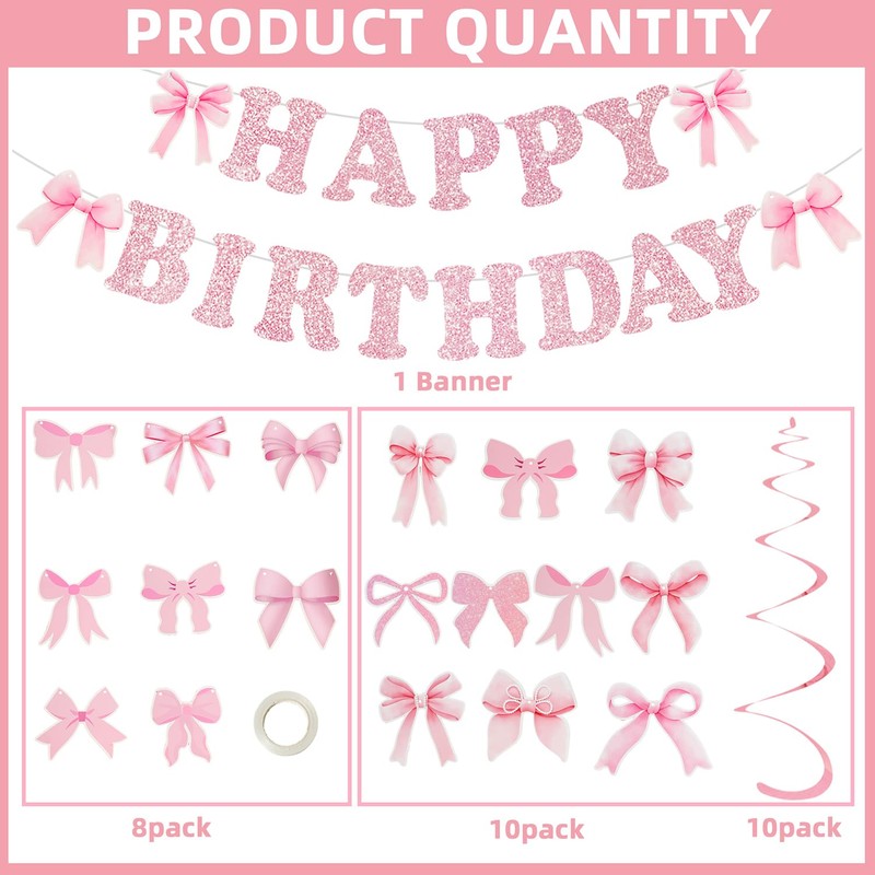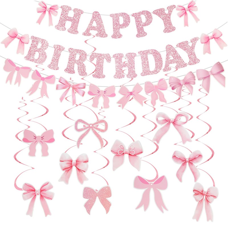 - Pink Bow Birthday Decoration Set: You will get 1 set Bow theme HAPPY BIRTHDAY banner, 1 set bow garland banner,10 pack pink bow Haning Swirls, fun and chic, bringing an extra dose of joy and elegance to the party