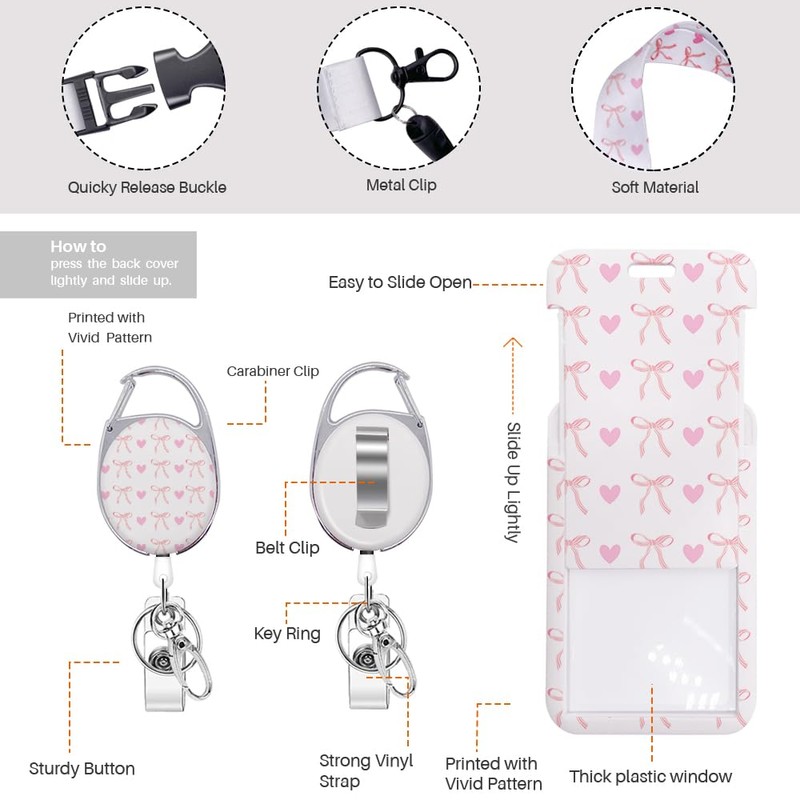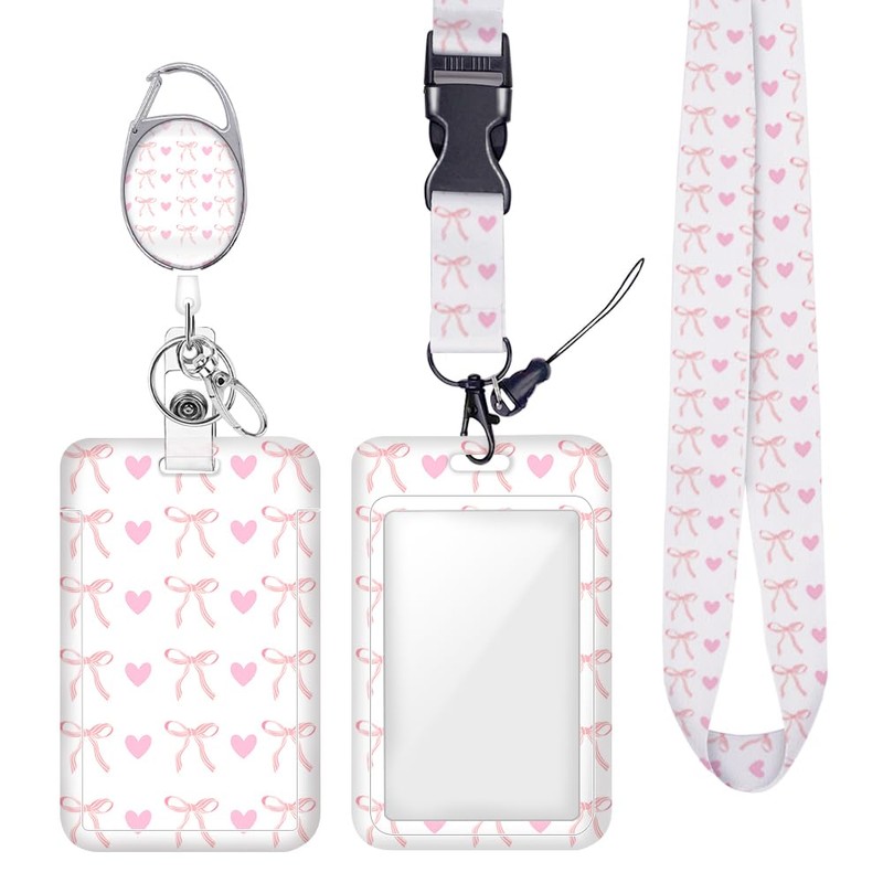 Pink Bow Heart ID Badge Holder Badge Reel Lanyards for ID Badges Work Vertical Protector Retractable Carabiner Clips Heavy Duty Key Lanyard for Women Salesman Dustman Editor Electrician Office Gifts