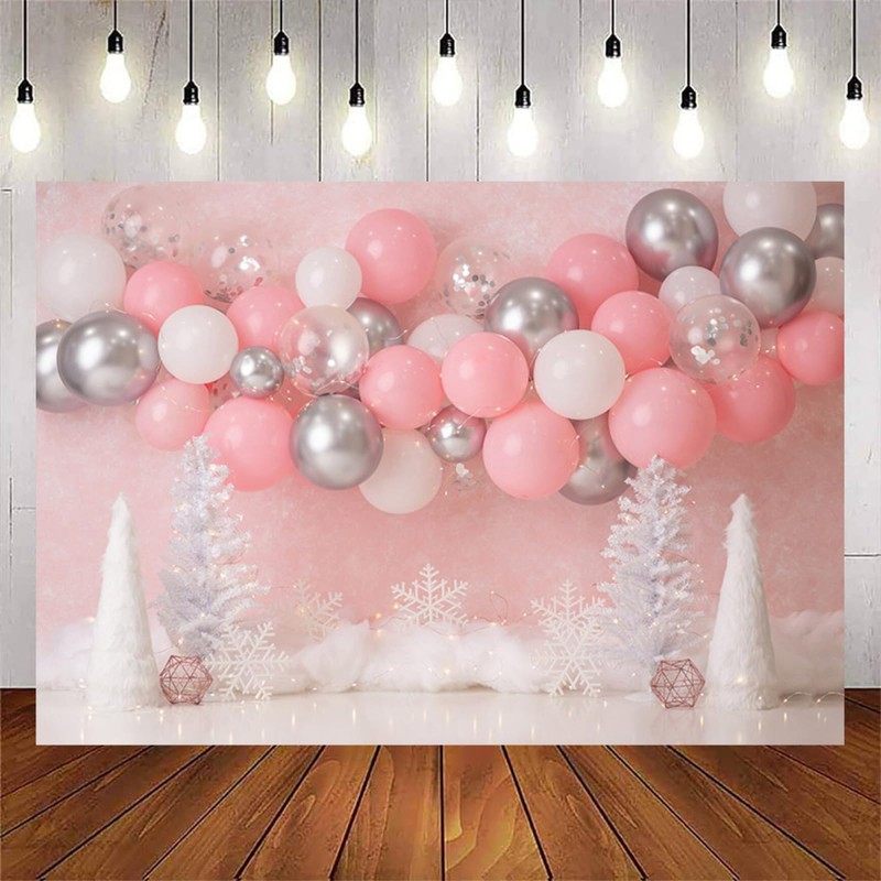 Pink Christmas Backdrop Winter Wonderland 1st Birthday Party Photography Background Snowflake Balloons Family Christmas Birthday Party Decorations Newborn Baby Shower Banner,7X5FT