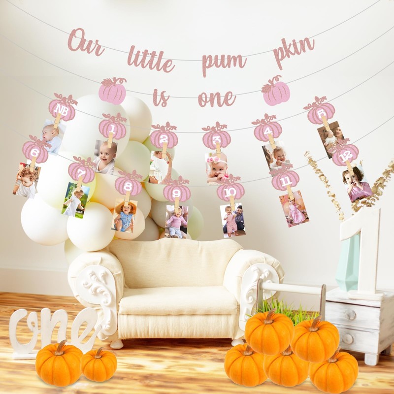 - 【Package Contents】: You will receive including "Our little pum pink is one" pumpkin banners, 1 set of 1st birthday photo banners from newborn to 12 months old, including 13 small wooden clothespins (for hanging photos), 1 roll of string for hanging trolley banners.
