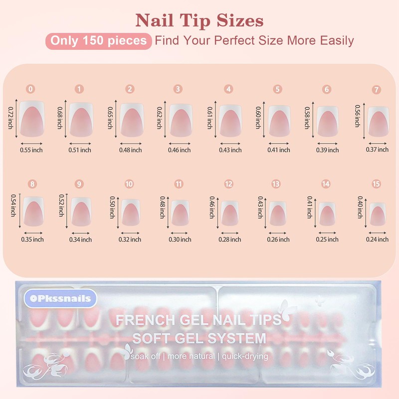 • 【15 SIZES FIT FOR ALL NAILS】OPkssnails french gel press on nail tips offer a wide selection of nail tip sizes, Includes 15 different sizes 150pcs french gel x nail tips, making it easier to find the right size for your nails, doesn't crease when bent, making it fast, easy and accurate when making a pinched set of nails. Press on french tip nails easy to keep and having longer lifespan