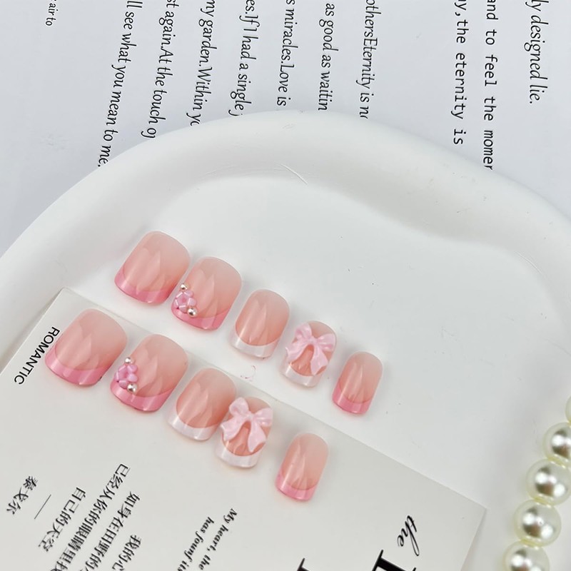 - Cute Bow Nails Kit : 24 PCS ,12 different sizes of short square press on nails with rhinestones flower nails , 24 jelly glue, 1 nail file, 1 wooden stick.full range of tools meet all your cute nails decor supplies wearing needs. It can be worn repeatedly so that you can replace it at any time