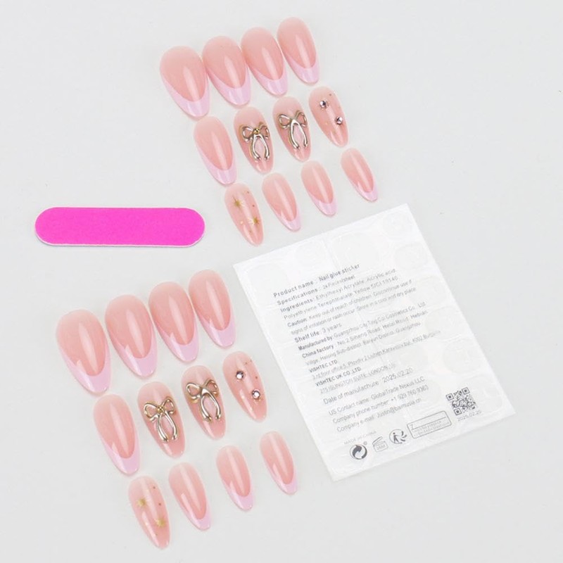 Pink French Tips Press on Nails Medium Almond Fake Nails with Gold Bow Charm Design Golded Star Diamond Glue on Nails Glossy Skin Tones False Nails Full Cover Summer Nails for Women Manicure 24Pcs