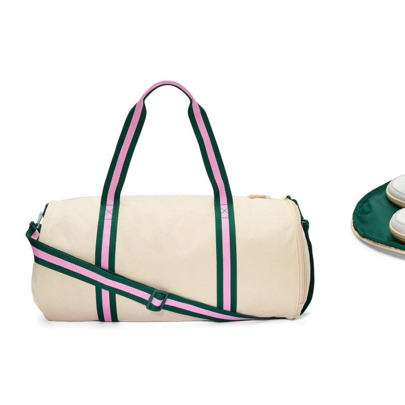 The Victoria's Secret PINK Dorm Duffle Bag is a new release for 2025, featuring adjustable straps for added versatility. This large rectangular bag in beige with green and pink accents is perfect for travel, casual outings, and business trips. The duffle bag is lined, has inner and outer pockets, and is made of lightweight cotton material. It also comes with a detachable strap and a zip closure for security. The double handles and logo pattern add a stylish touch to this practical and functional bag, making it a must-have accessory for any woman on the go.