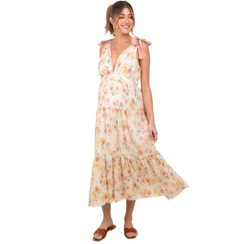 PinkBlush Cream Floral Shoulder Tie Deep V-Neck Tiered Maternity Maxi Dress