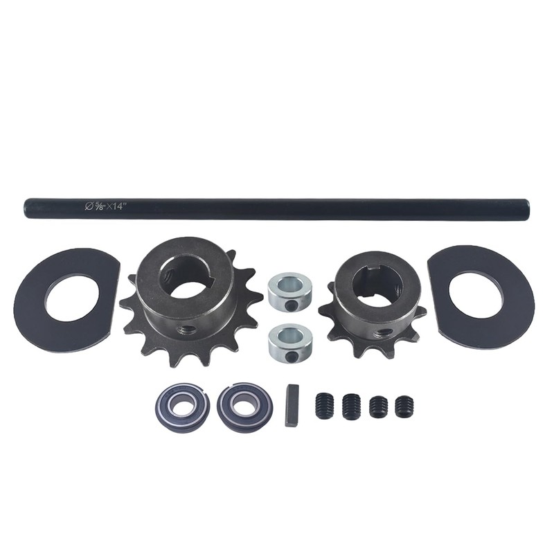 Package Include: 1 * 5/8" by 14" Jackshaft + 2 * 5/8" ID Sealed Precision Bearings + 2 * Collar 5/8" ID + 2 Bearing hangers + 1 * #35 14 Tooth 5/8" ID Sprocket + 1 * 10 Tooth 5/8" ID Sprocket with built in Key + 1 * 3/16" by 3/16" by 3/4" Keyway + 4 * screws